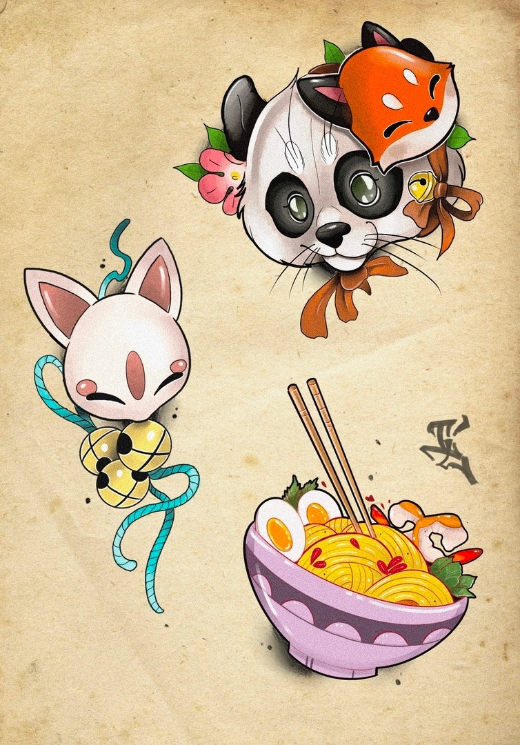 СВОБОДНЫЙ ЭСКИЗ ТАТУ С ПАНДОЙ, КИЦУНЕ И ЛАПШОЙ