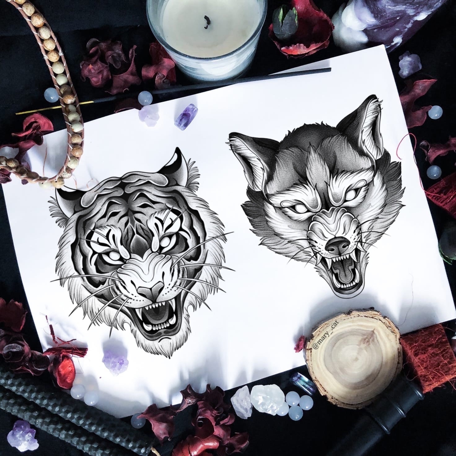 Свободный эскиз тату с тигром и волком (Мария Котова)