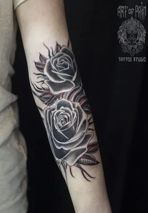 Татуировка женская на предплечье олд скул чёрные розы 1007