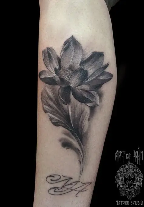 Татуировка женская Black&Grey на предплечье пион и надпись 1132