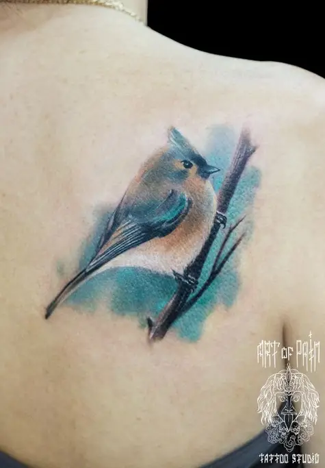 Татуировка женская акварель на лопатке птица 1135