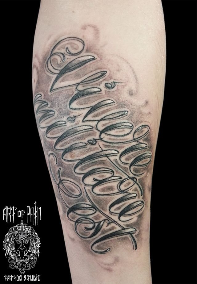 Татуировка женская каллиграфия на предплечье надпись на сером фоне 1143