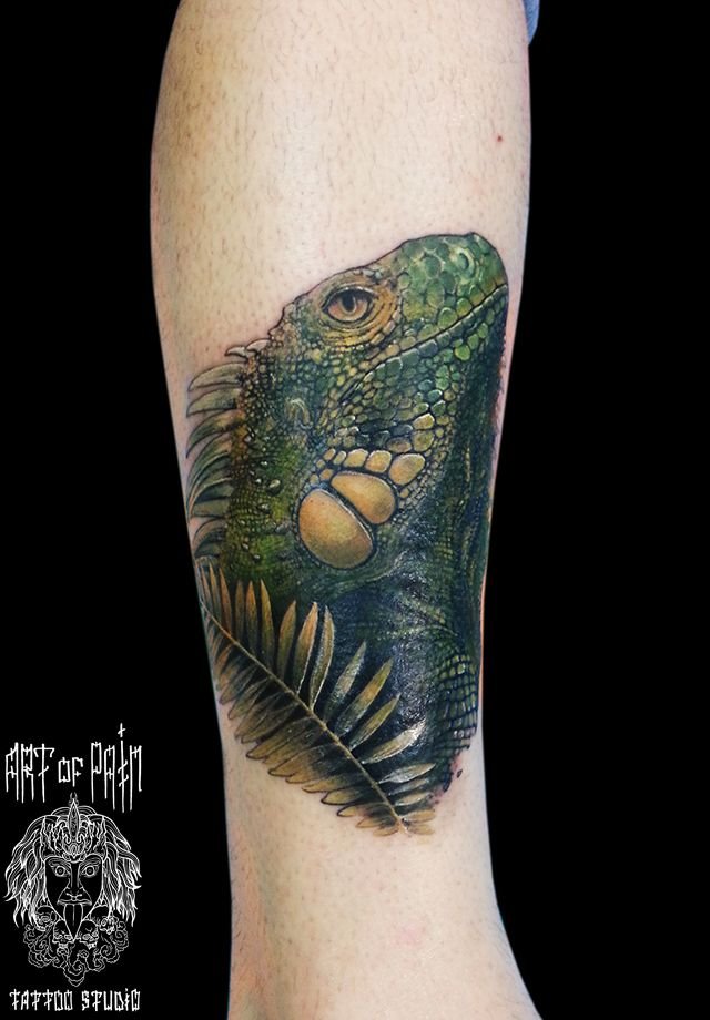 Татуировка женская реализм на голени игуана 1183