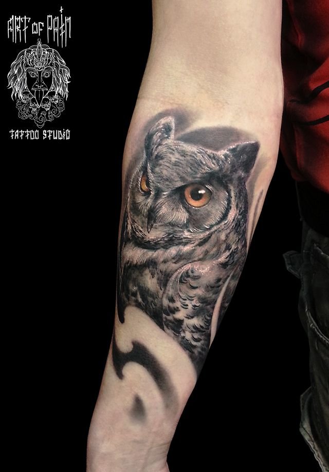 Татуировка мужская реализм на предплечье ушастая сова 1194