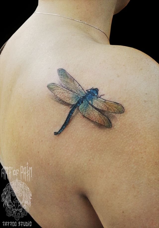 Татуировка женская реализм на лопатке стрекоза 1195