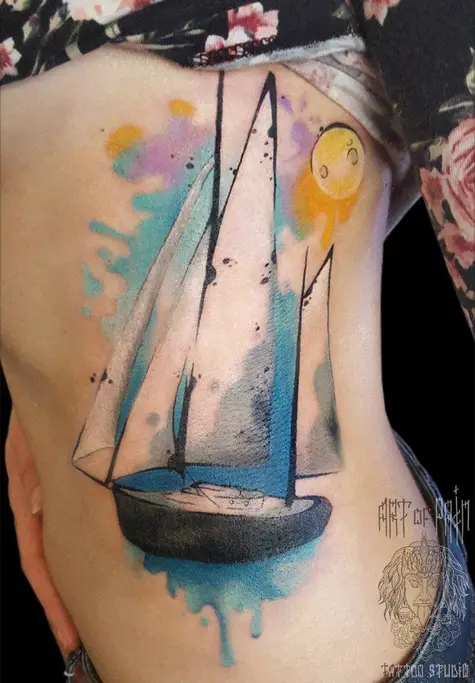 Татуировка женская акварель на боку лодка 1231