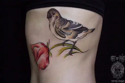 Татуировка женская акварель на ребрах птица 1235