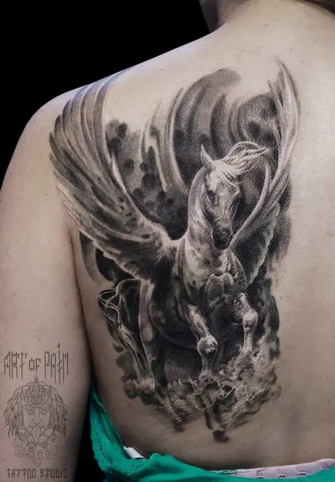 Татуировка женская Black&Grey на лопатке пегас 1259