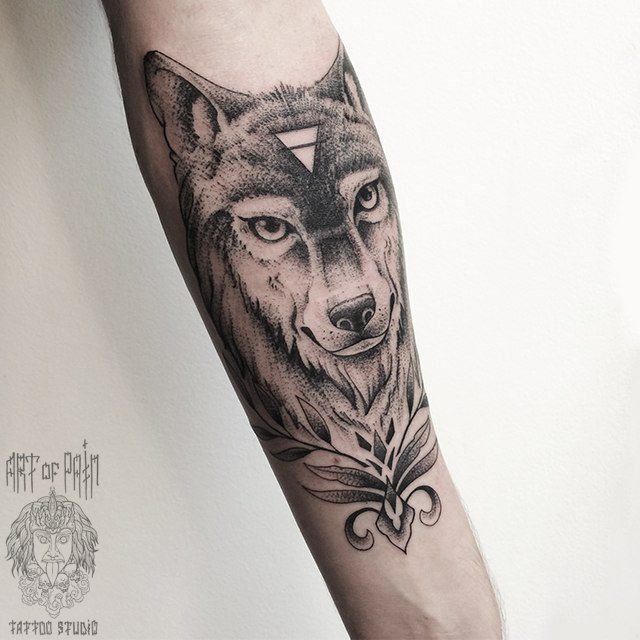Татуировка женская дотворк на предплечье волк с узором 1277