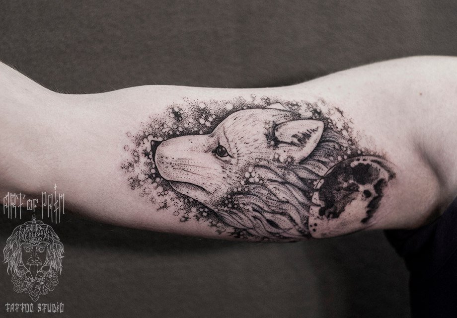 Татуировка женская дотворк на предплечье волчонок с луной 1280