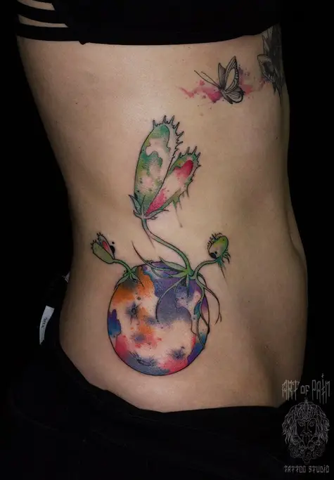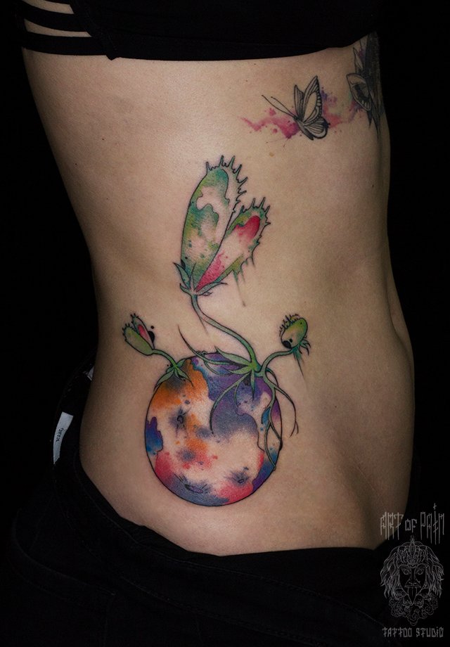 Татуировка женская акварель на боку мухоловка 1432