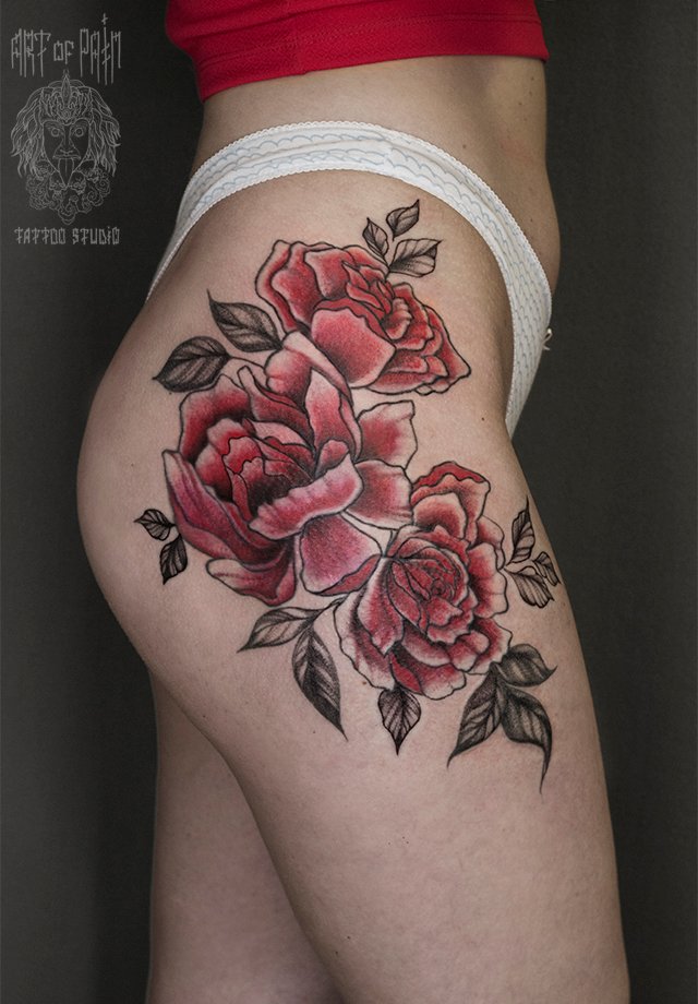 Татуировка женская графика на бедре красные пионы 1447