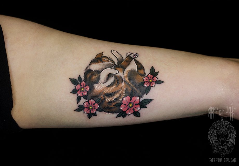 Татуировка женская нью скул на предплечье кошка 1469