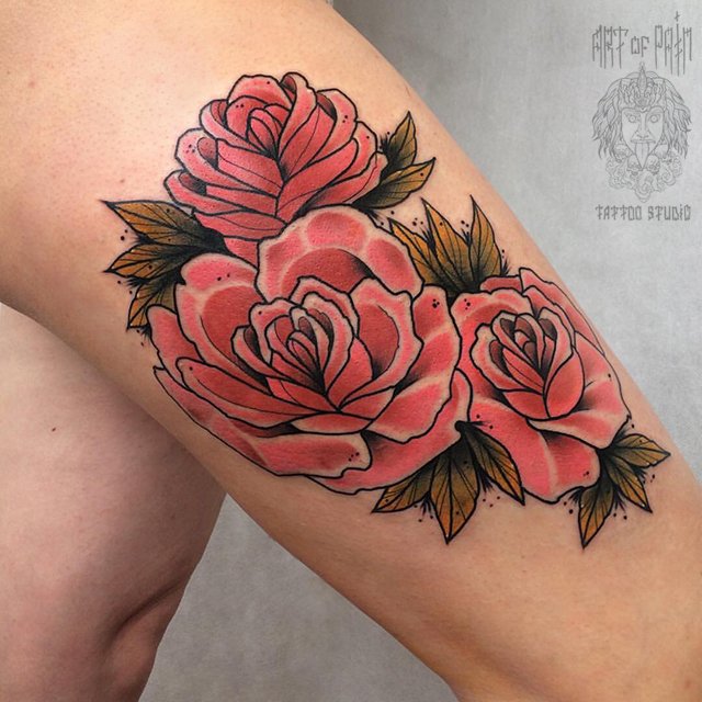 Татуировка женская нью скул на бедре розы 1484