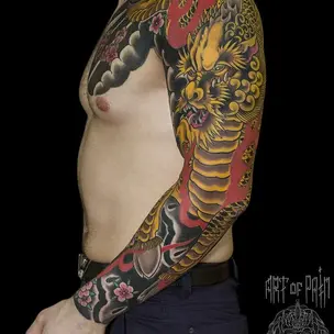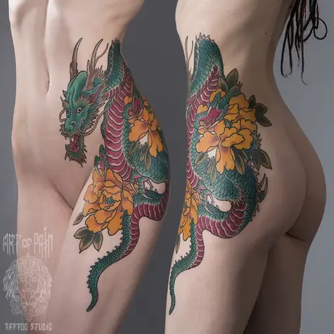 Татуировка женская Япония на боку дракон с цветами (Ольга Добрякова) 1492