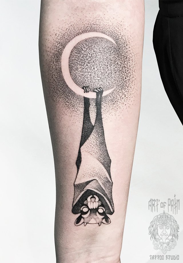 Татуировка женская дотворк на предплечье летучая мышь 1533