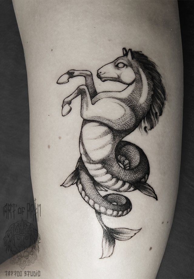 Татуировка женская дотворк на плече гиппокампус 1548