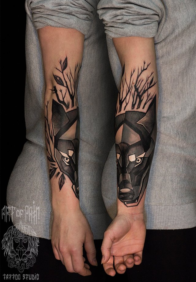 Татуировка женская нью-скул на предплечье волк 1582