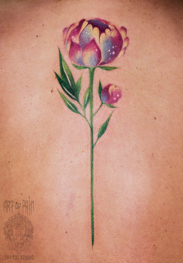 Женская татуировка на спине цветок в стиле акварель 1600