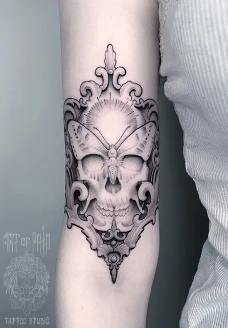 Татуировка женская графика на плече череп, бабочка и орнамент 1607