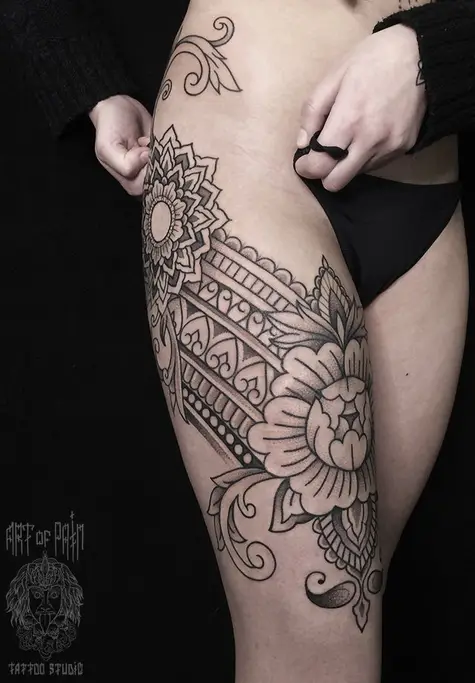 Татуировка женская дотворк на бедре орнамент 1621