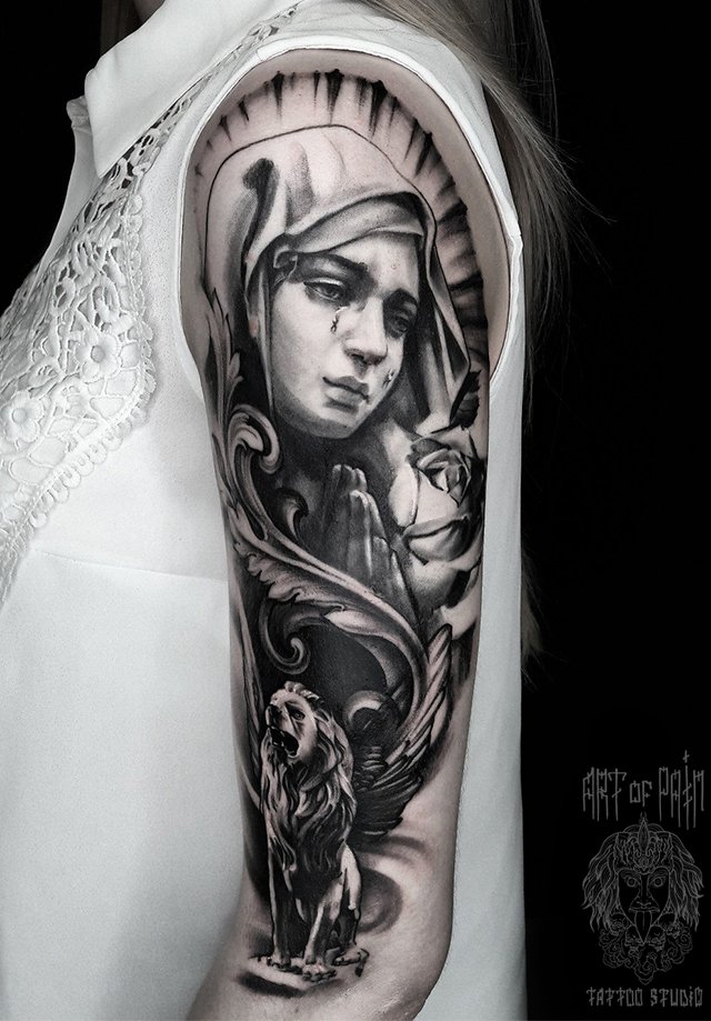 Татуировка женская black&grey на плече дева Мария 1648