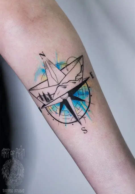 татуировка женская графика на предплечье роза ветров и бумажный кораблик 1737