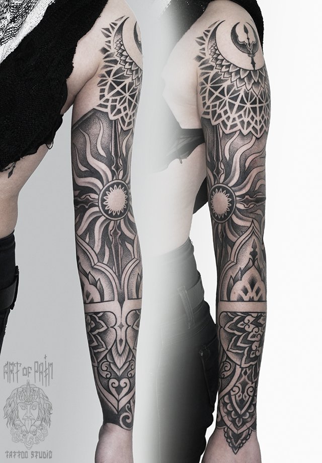 Татуировка женская дотворк тату-рукав солнце 1798