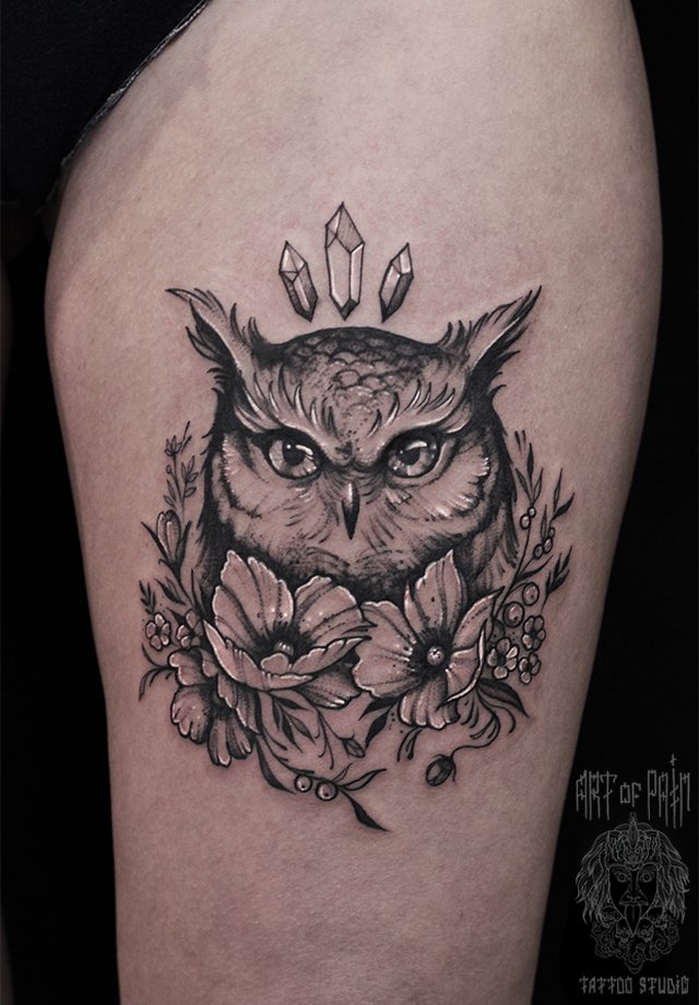 Татуировка женская black&grey на бедре сова 1806