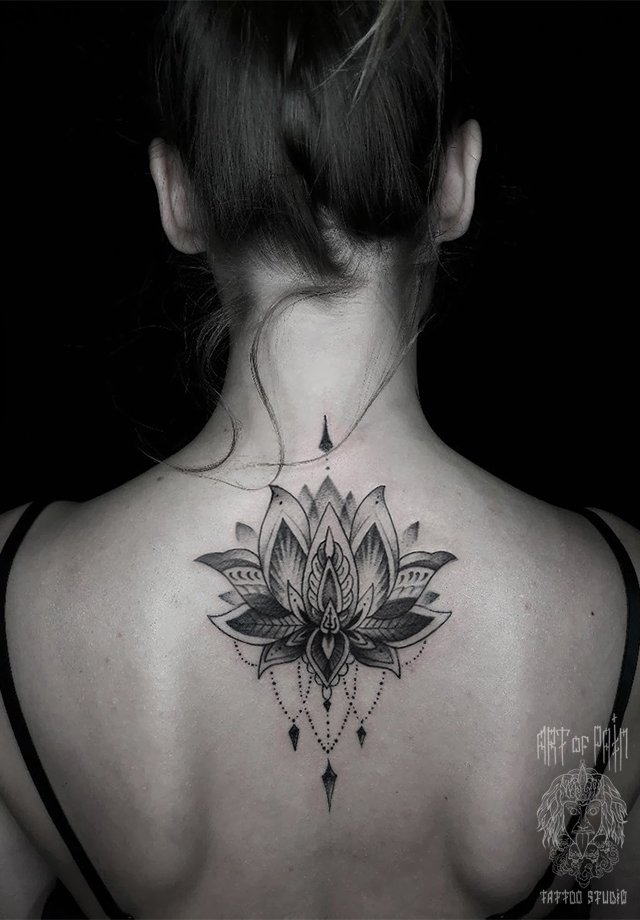 Татуировка женская дотворк на спине лотос 1857