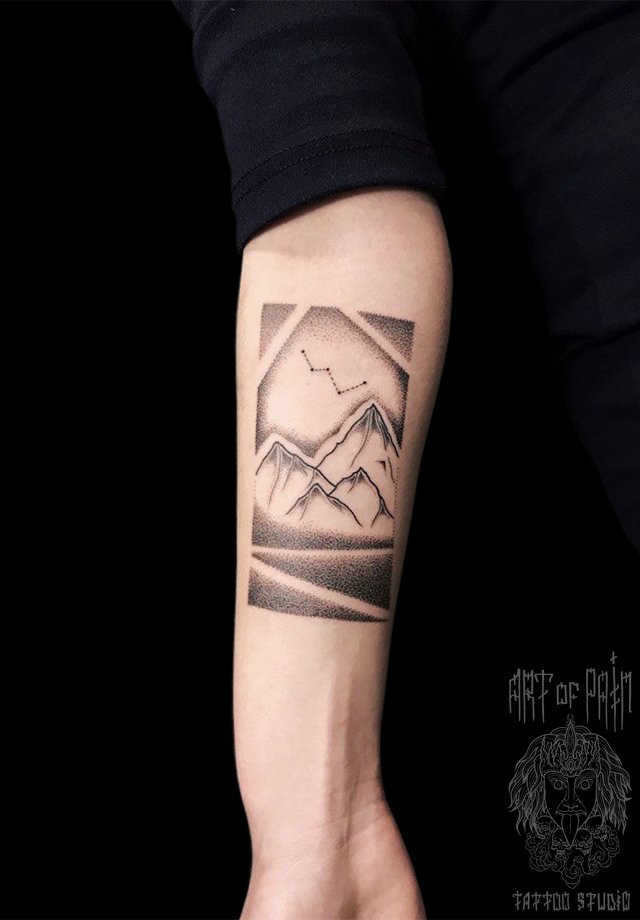 Татуировка женская дотворк на предплечье горный пейзаж 1877