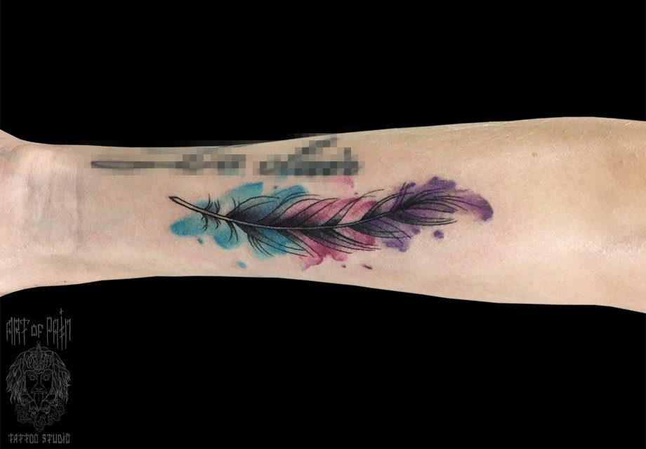 Татуировка женская акварель на предплечье цветное перо 1891