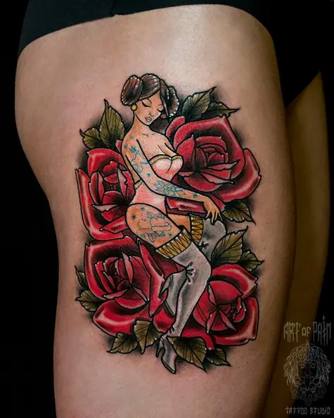 Татуировка женская нью-скул на бедре девушка и розы 1916