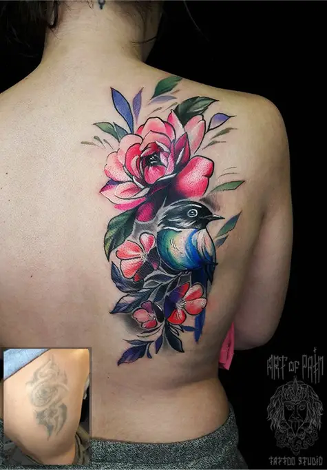 Татуировка женская нью-скул на спине птичка и цветок 1921