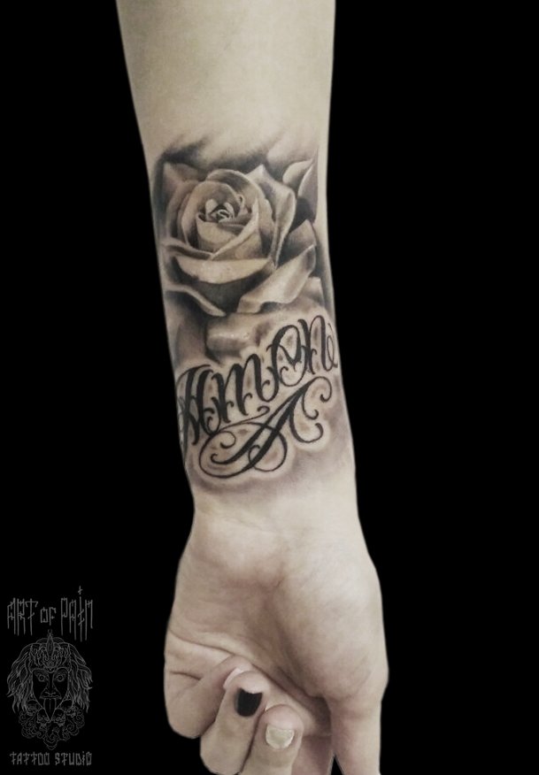 Татуировка женская чикано на предплечье роза и надпись 1934