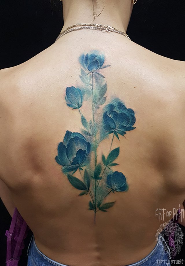 Татуировка женская акварель на спине пионы 1977