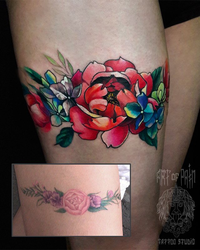Татуировка женская нью-скул на бедре пионы кавер 1991