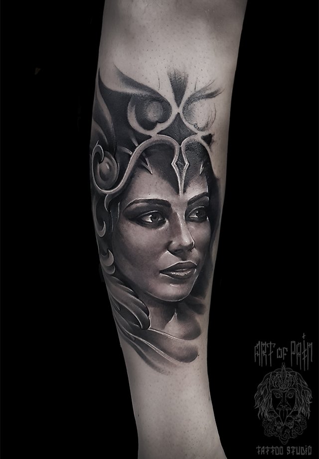 Татуировка женская black&grey на голени девушка в шлеме 2021