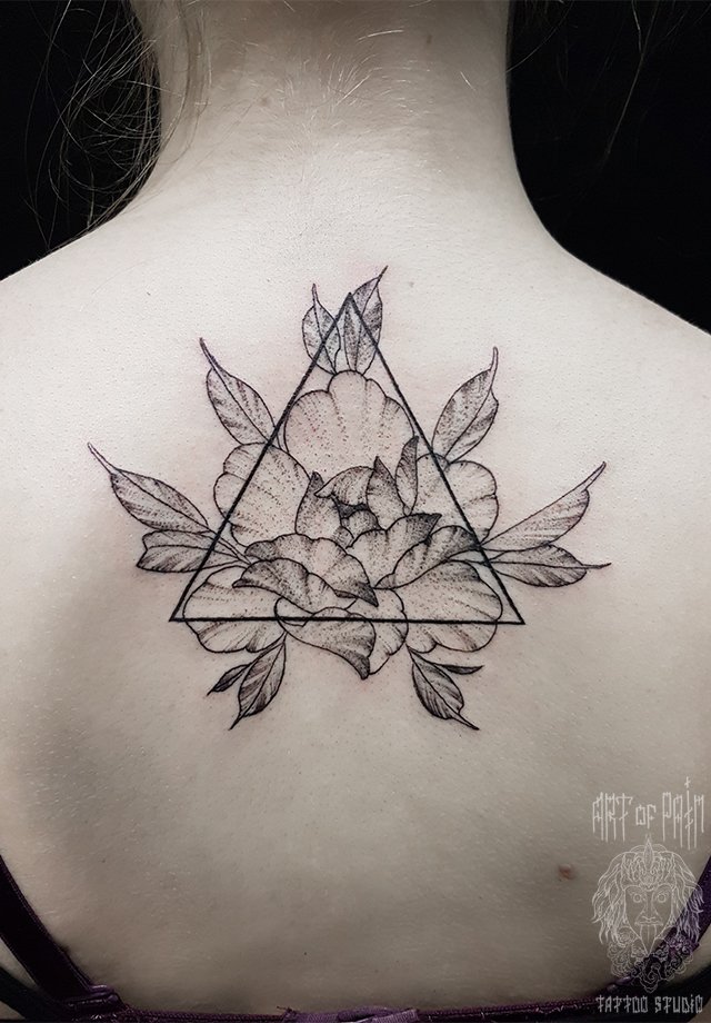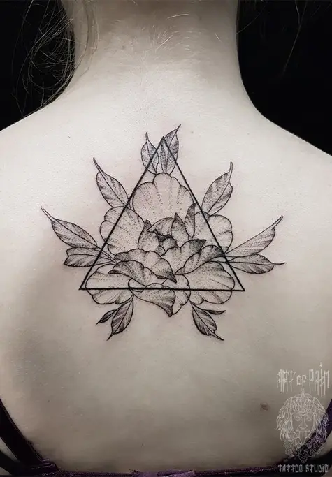Татуировка женская графика на спине цветок в треугольнике 2040