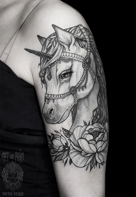 Татуировка женская графика на плече единорог 2054