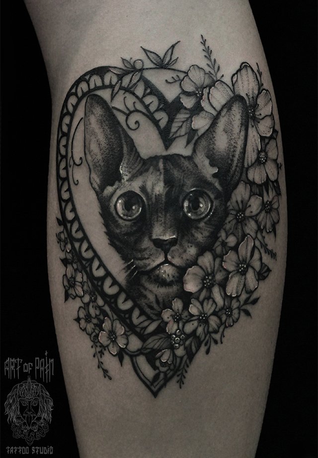 Татуировка женская black&grey на голени кот сфинкс 2072