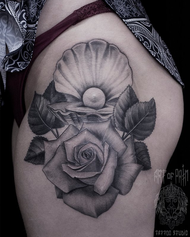 Татуировка женская black&grey на бедре жемчужина и роза (Слава Tech Lunatic) 2093