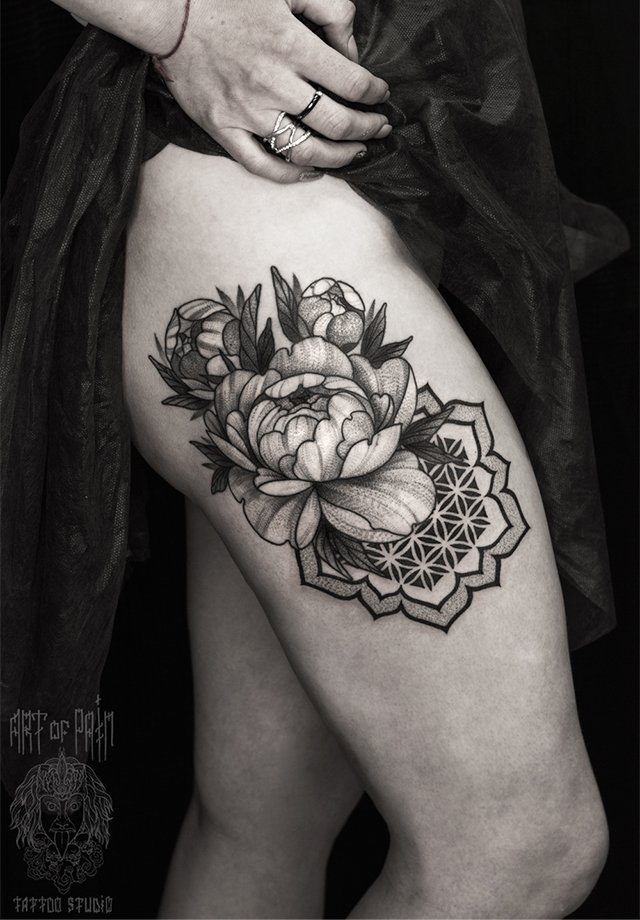 Татуировка женская графика на бедре пионы и орнамент 2098