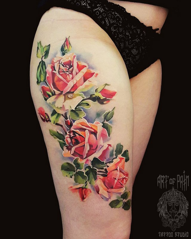 Татуировка женская реализм на бедре бутоны роз 2124