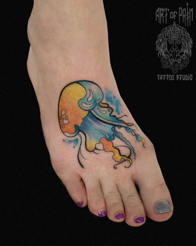 Татуировка женская акварель на стопе медуза 2130