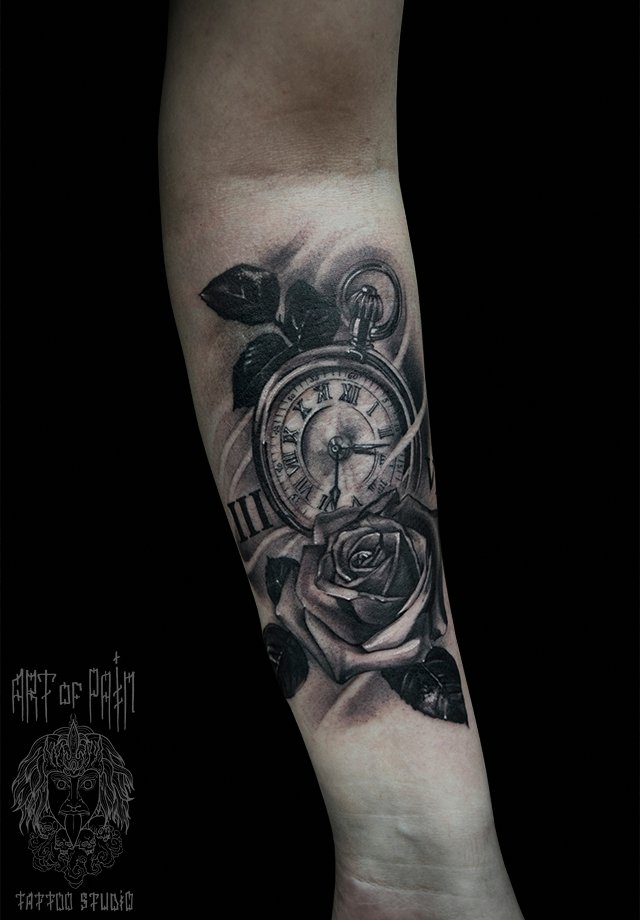Татуировка женская black&grey на предплечье часы и роза 2148