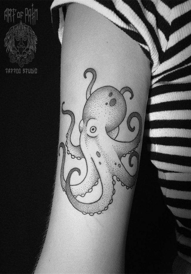 Татуировка женская дотворк на бицепсе осьминог 2178