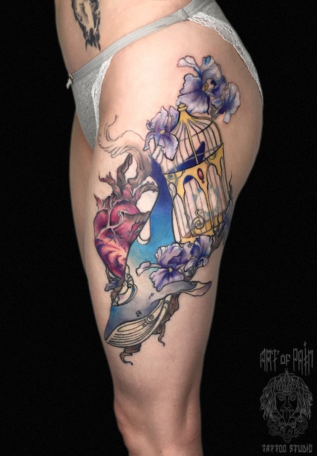 Татуировка женская акварель на бедре кит и клетка 2215