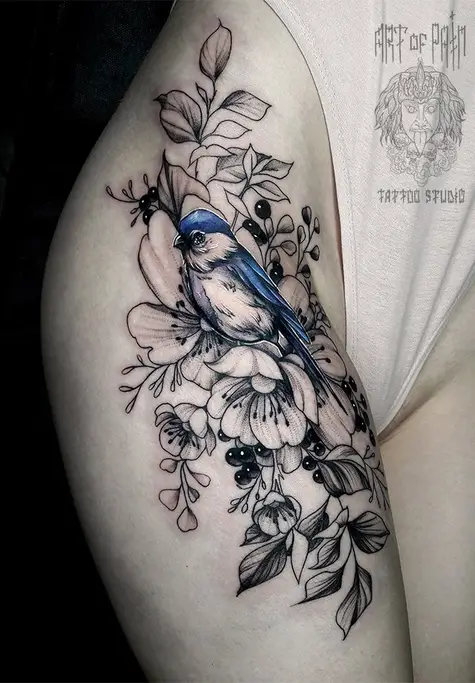 Татуировка женская графика на бедре птица в цветах 2255