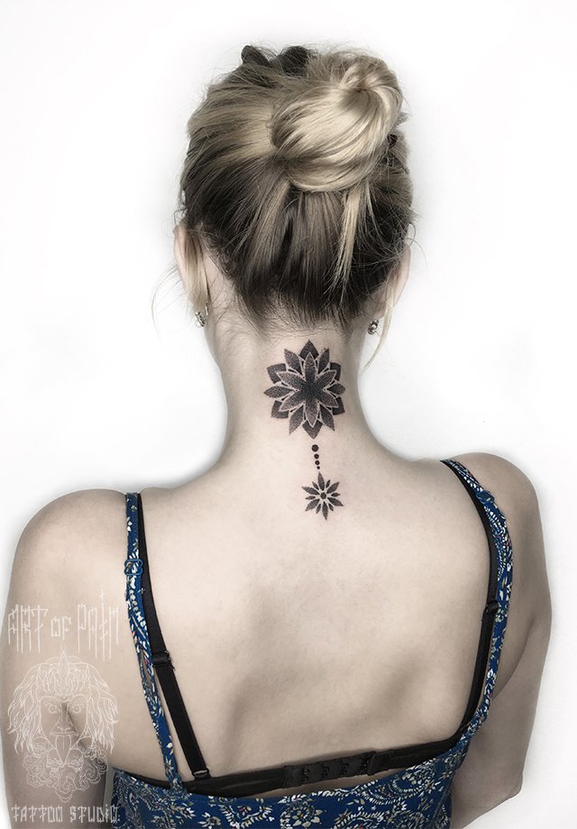 Татуировка женская графика на спине и шее узор 2316